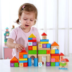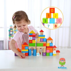 Raznobojni drveni blokovi na slaganje koji pospješuju razvoj fine motorike kod djece. Na blokovima se nalaze brojevi kao i slova alfabeta što će igru učiniti zanimljivijom. U setu dolazi 70 drvenih blokova različitih oblika.