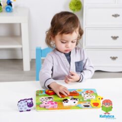 Divna i raznobojna umetaljka sa velikim drvenim 3D životinjama sa farme, izrezanim iz ploče, a zadatak mališana je da po obliku ih stave u tako gdje pripadaju po obliku.