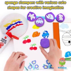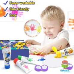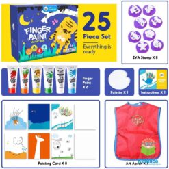 Dječiji set se sastoji od 6 tubica 60ml boje za bojenje prstima, paletom za bojenje, 2 držača pečata, 6 EVA britvica, 2 bijela postolja, 2 ploče, 1 postolje za naljepnice, 1 kreativne naljepnice, 1 makazice, 1 ljepilo i uputstvo. Sve boje su EN71-7 testirane po standardima EU i sigurne za okolinu i djecu. Dimenzije: 21x17x10cm.
