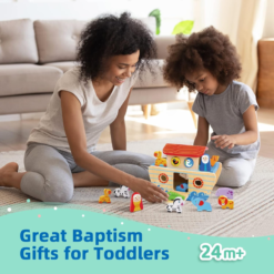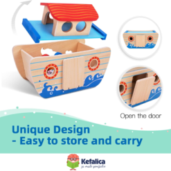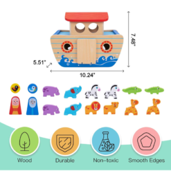 Novi i poboljšani set za igru Nojeva barka. Djeca dobijaju priliku da ovu klasičnu priču prenesu u stvarni život dok slažu svoje životinje u Nojevu barku. Na bočnoj strani broda nalaze se izrezani oblici kroz koje se životinje mogu provući. To će pomoći u poboljšanju finih motoričkih sposobnosti. Napravljeno od kvalitetnog drveta i netoksičnih boja.