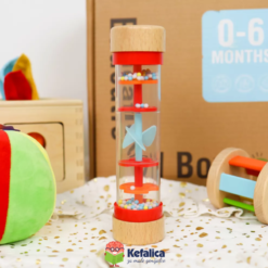Tooky Toy edukativna kutija sadrži 6 senzornih igračaka namijenjenih bebama od rođenja do 6 mjeseci. Svaka igračka u paketu potiče zdrav psihomotorni razvoj, stimulirajući bebine čulne sposobnosti. Set uključuje 10 dvostranih kontrastnih kartica, plišanu loptu sa zvonom, štap za kišu za pjeskarenje, drvenu zvečku, rotirajući bubanj za zveckanje, kutiju za skidanje obojenih maramica, te detaljno uputstvo za roditelje na engleskom jeziku. Igračke su ekološki prihvatljive, izrađene od drveta iz održivog šumarstva i sigurne za bebu, što čini ovu edukativnu kutiju idealnim poklonom. Dimenzije: 32×26.3x14cm
