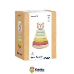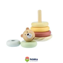 Djeca prvo vježbaju hvatanje i podizanje prstenova, zatim ih pokušavaju nanizati na drvenu osovinu u ispravnom redoslijedu. Kada slože toranj, postavljaju glavu medvjedića na vrh kao završni detalj. Ova jednostavna, ali efektna igračka pruža osjećaj postignuća i razvija upornost kod djeteta.