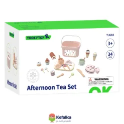 Popodnevni čaj – Set sa kutijom (3+) je predivan drveni set koji omogućava djeci da kroz maštovitu igru uloga organizuju vlastiti čajni ritual. Ovaj komplet sadrži drvene kolače, tacnu, šoljice i tanjire, pružajući mališanima mogućnost da pripreme i posluže popodnevni čaj svojim gostima – bilo da su to roditelji, prijatelji ili omiljene plišane igračke.