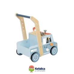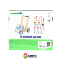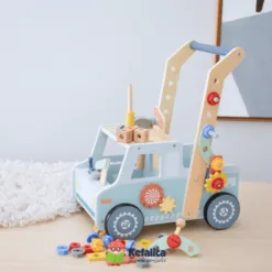 Dizajnirana za male istraživače i buduće majstore, ova hodalica nudi radni sto sa alatima gdje djeca mogu koristiti 5 različitih alata – čekić, ključeve, lenjir, odvijač i testeru – kako bi pričvršćivali 44 dodatka poput vijaka, zupčanika i dasaka.